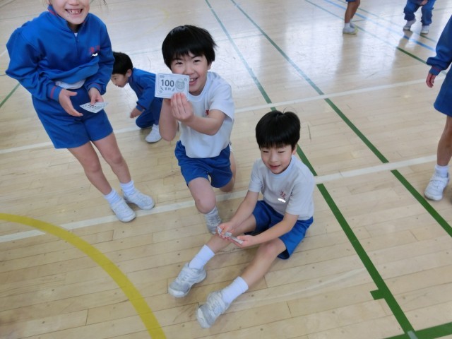 1年生は、特別活動で、お金を「もらう」「つかう」「ためる」の三つを体験的に学んでいました。重りを運んだ対価としてお金をもらい、とても喜んでいました。また、友達が運んでいるのを手伝う姿もすてきでした。
