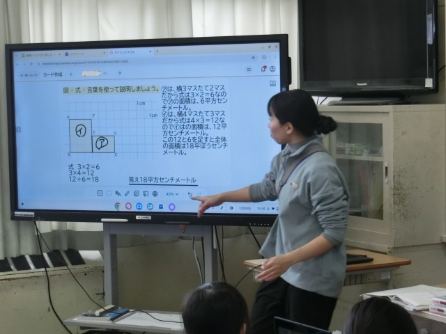 4年生も、算数科で、面積の求め方を学習していました。既習(正方形や長方形の面積の求め方)を生かし一人一人が求め方を考え、クラウドツールで共有していました。