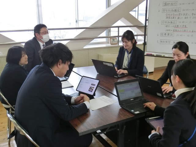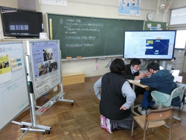 16日、在校生、先生方、学校(校舎)、家族等の4つのプロジェクトの活動内容を相談していました。「どんな集会にしようか」「どんな贈り物をしようか」等、タブレット端末も活用しながら対話していました。