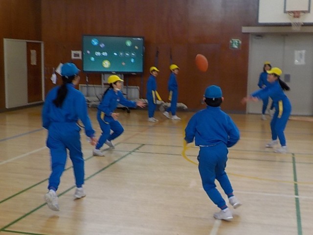 4年生は、体育科で「タグラグビー」に取り組んでいます。色団ごとに2名ずつで対戦していました。