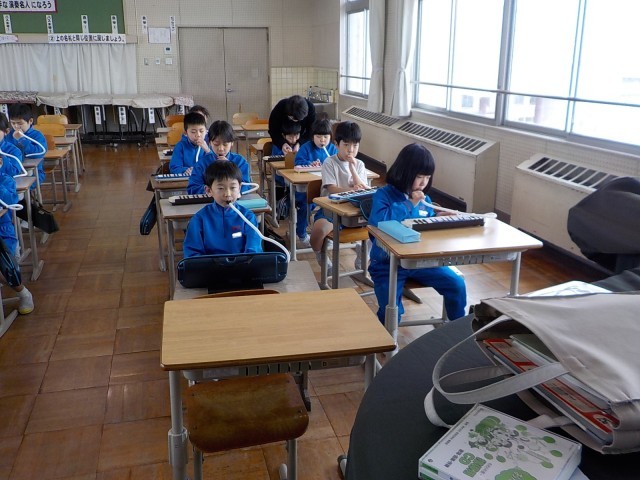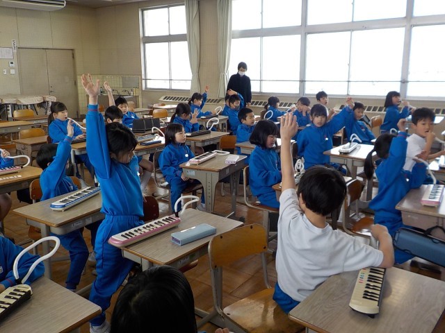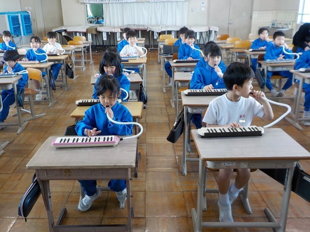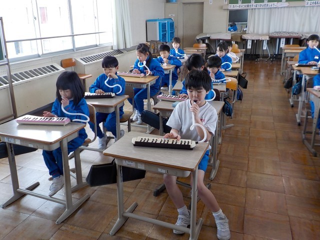 1年生が、音楽室で鍵盤ハーモニカの練習をしていました。曲は「きらきらぼし」です。