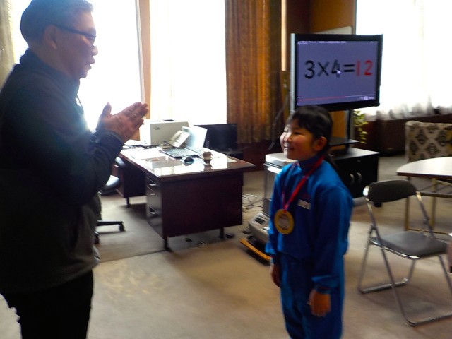 これまで練習してきた成果を発揮し、まずは担任の先生に、次に教頭先生に、そして最後は校長先生に聞いてもらいます。校長室では、二つのチェックがあります。一つ目は、カードを引き、書かれている数字の段を諳んじます。それができると、モニターに映ったかけ算に答えていきます。アトランダムなので、一つ一つを覚えていないと答えられません。