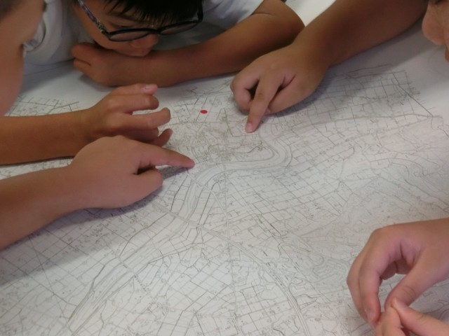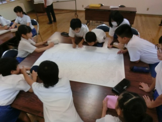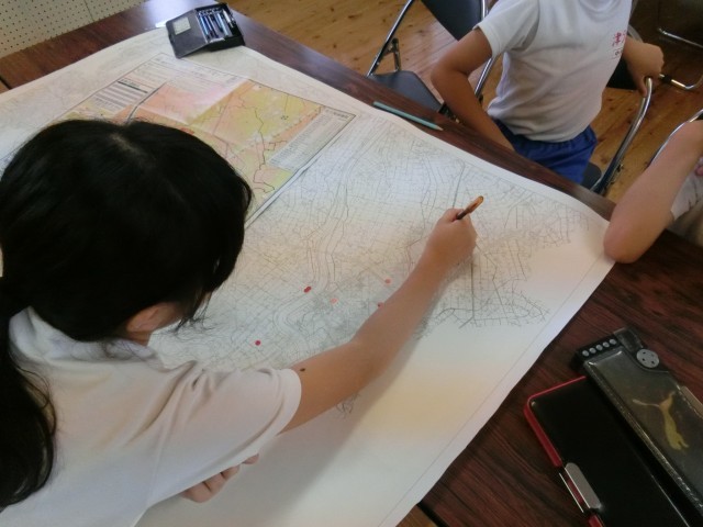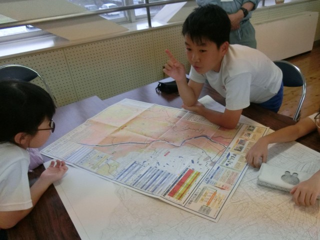 最初に、水害が発生したときの安全な避難についてお話を聞きました。次に、グループで防災マップ作りをしました。まず、白地図上に自宅を位置付けます。次に、ハザードマップを参考に、水害によって家が壊れる等の被害予想される箇所に赤線を引きました。それについて、「小学校は水がつきますが、2階にいれば大丈夫です」「小学校は避難所になるので、安全に避難したあと、学校をことを教えてあげるなど、みなさんも避難所のお手伝いをしてほしいのです」と教えてくださいました。