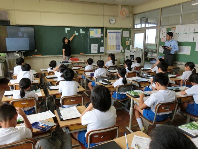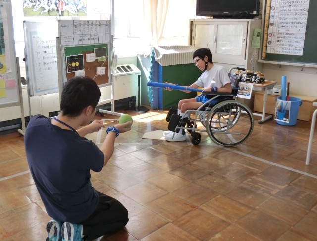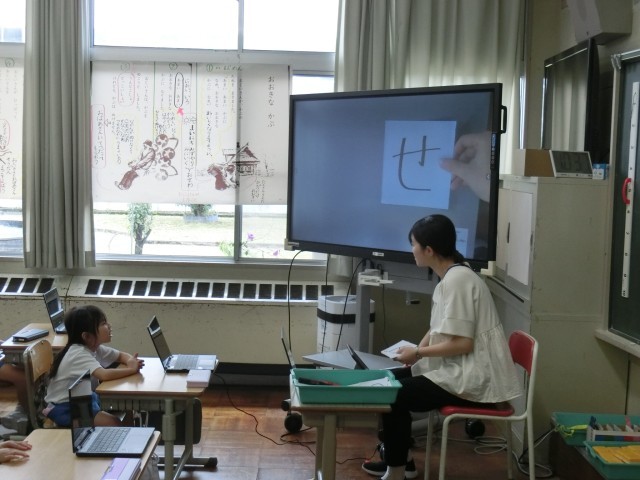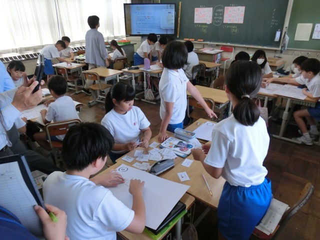 1年国語科「かたかなをみつけよう」では、最初に「ひらがな」と「かたかな」の違いを、一斉指導で確認していました。3年国語科「漢字の組み立て」では、「しんにょう」や「もんがまえ」等の部首を確認した後、それらが使われている漢字を個人で探し、手入力でタブレット端末に表していました。5年算数科「奇数と偶数」では、グループごとに数字の仲間分けをし、それらの性質を考えていました。あおぞら級自立活動「投げて!打って!動いて!」では、体の使い方を工夫してバットでボールを捉え、野球を楽しんでいました。