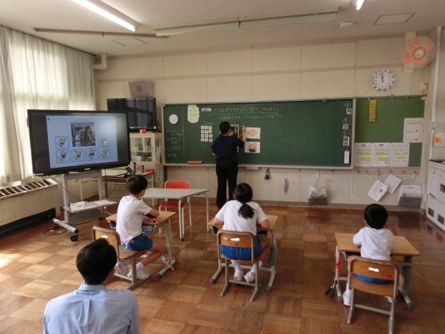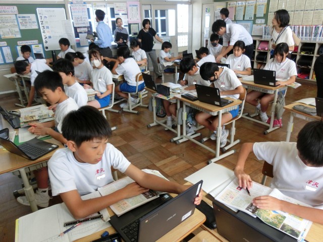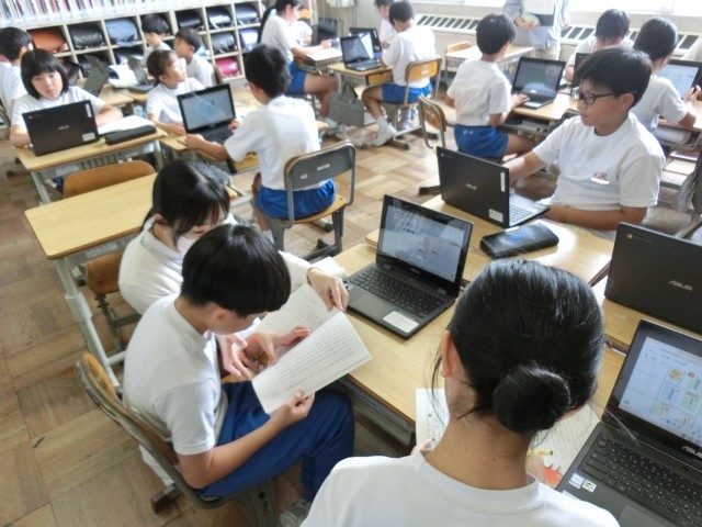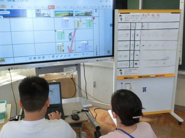 4年国語科「ごんぎつね」では、登場人物の気持ちを読み取り、デジタルの付箋を書き込み、みんなで共有していました。6年社会科では、「源氏は、どのようにして長く政治を安定させたのか」という課題に対して、友達と協働しながら、教科書から必要な情報を集め、解決しようとしていました。はばたき級自立活動「こんなとき、どうする?」では、困った場面ででどんな言葉を使えばよいのか、みんなで考えを出し合っていました。通級指導では、友達のデジタル付箋の記述も参考に、物語の本文から読み取った情報を表していました。