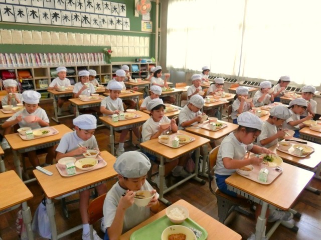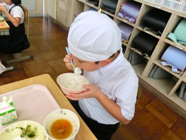この日の給食は、それにちなんだ献立です。「かぼちゃのそぼろ煮」の中のかぼちゃには、目のよいとされているビタミンAが多く含まれ、アントシアニンを含んでいるプルーンがデザートでした。1年生、2年生、3年生の教室で、その話をすると、「なるほど」という表情で、みんなおいしく食べていました。
