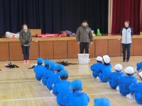 体育館に集まって、予行の目標や注意を確認しました。最初は、児童会代表の開会の挨拶です。「やるぞ」という良い緊張感が広がっています。