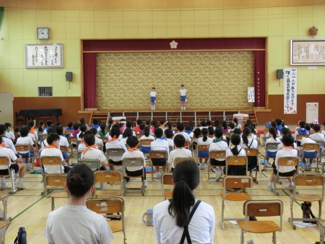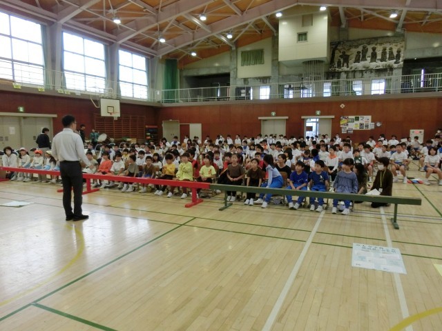 体育館に集まって、予行の目標や注意を確認しました。最初は、児童会代表の開会の挨拶です。「やるぞ」という良い緊張感が広がっています。