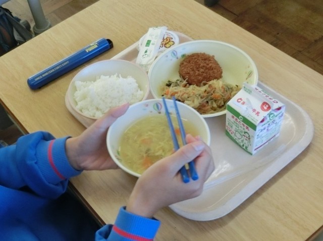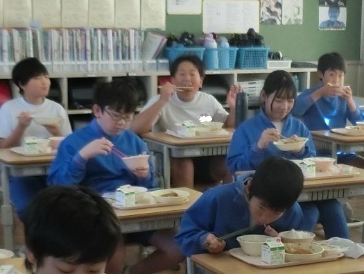 今日の6年生の給食は、セレクト給食です。主菜(春巻き・メンチカツ)とデザート(スイートポテト・ぶどうゼリー・栗のムース)を、一人一人が選びます。子供たちはとても満足していて、笑顔でおいしく食べていました。
