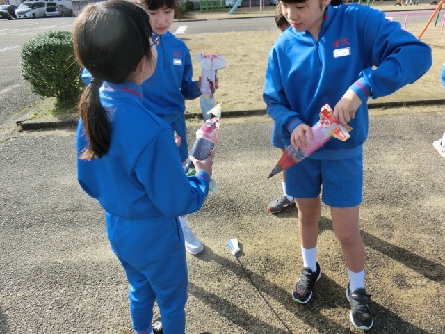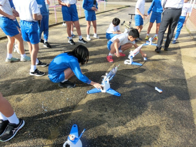 4年生は、理科の学習で、閉じ込めた水と空気の性質について学んでいます。子供たちは、実験を通して理解した「空気に力を加えると体積が小さくなり元に戻ろうとするが、水は力を加えても体積は変わらない」という性質を利用して、ペットボトルロケットを作りました。