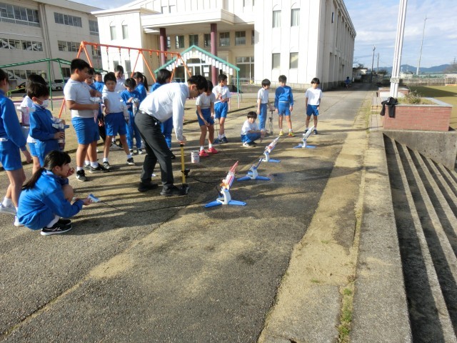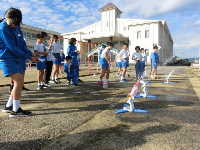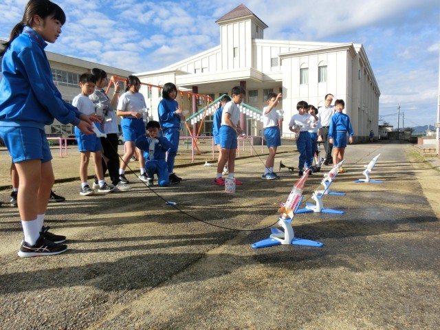 それを、秋晴れの空に向かって一人一人発射すると、勢いよく飛び出し、中には、50メートルを超えるロケットもありました。子供たちは、それを見て歓声をあげていました。