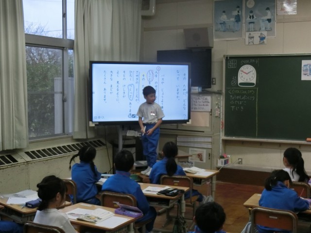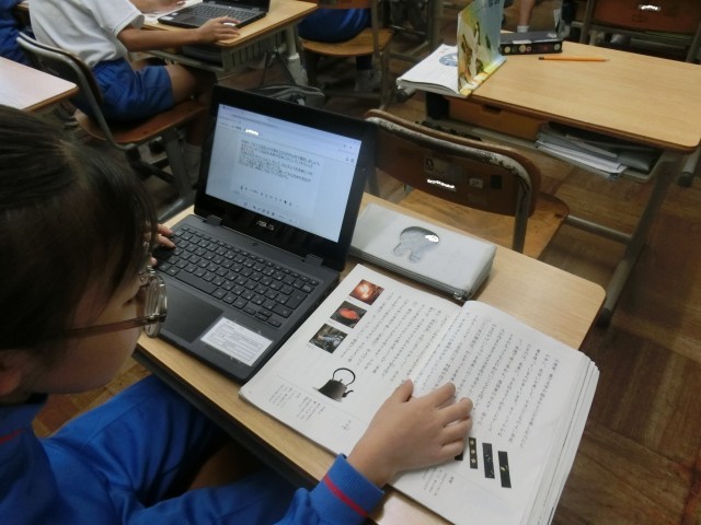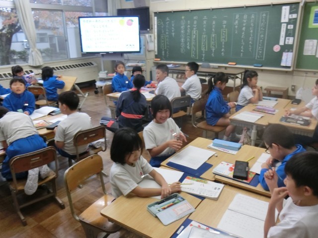 4年生は、要約に挑戦していました。200字以内という条件があるそうです。タブレット端末を使うと、文字数がカウントされ、修正もしやすいそうです。1年生は、文章の読み取りをしていました。「くわしく表している言葉」を見つけて、教科書に青線を引くそうです。見つけた子供が電子黒板で示していました。2年生は、グループで対話の練習をしていました。友達の困りごとを聞いて意見を伝えるそうです。