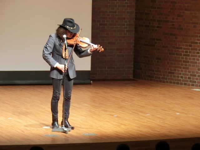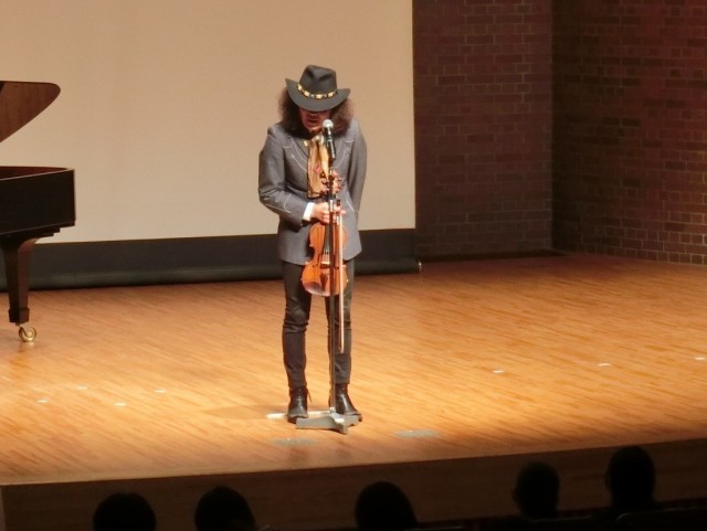 演奏のあと、ご自身の人生を語ってくださいました。障害のためにできなかったことが多かった中、「音楽をがんばろう」とヴァイオリンに情熱をかけられたそうです。また、くじけそうになったが、「自分の演奏をする曲をつくろう」と、他者と違う方法を考えたことで、自分の可能性に気付いたそうです。さらに、夢のもち方も教えてくださいました。それは、「他人を喜ばせる」ことだそうです。加えて「みんながやりたくないことをやる人を尊敬している」と、他者への感謝の大切さも伝えてくださいました。そして、最後に、失敗しても「いつかできる」と粘り強く夢に向かって挑戦することで夢が叶うことを強調されていました。