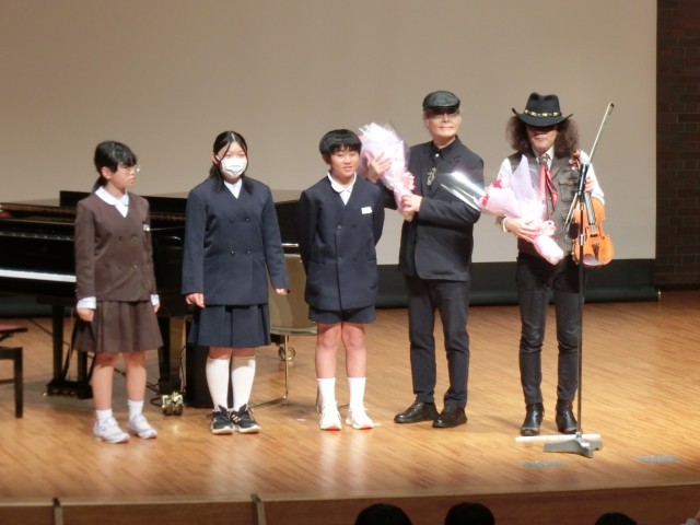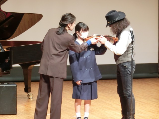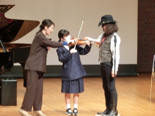 休憩後、各校の代表者が、講師の方に指導していただき、ヴァイオリンの体験をしました。講師の方は、初心者の子供たちがうまくできるように、ヴァイオリン・弦の持ち方や音の出し方を時間をかけて教えてくださいました。よい音がでると、会場から大きな拍手がありました。また、質問コーナーで成功の秘訣を尋ねれられると、講師の方は、「成功するまで続ける 止めなければ、いつかはかなう」と答えてくださいました。子供たちにとって分かりやすく、本質的なアドバイスをいただきました。。さらに、お礼の言葉とお花を贈ると、お二人はとても喜んでいらっしゃいましたた。