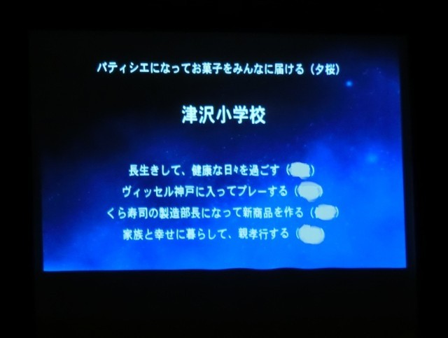 そして、会の最後には、子供たちの夢をスクリーンで映す恒例のエンドロールが行われました。講師の方には、子供たちの夢を音声に聞いていただきました。一人一人の夢は様々であり、それをみんなで共有できたことも素晴らしいことでした。今年も心温まる機会をつくってくださった小矢部ロータリークラブの皆様に心よりお礼を申し上げます。