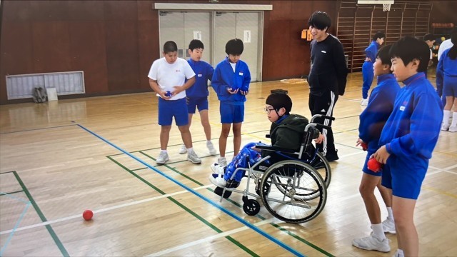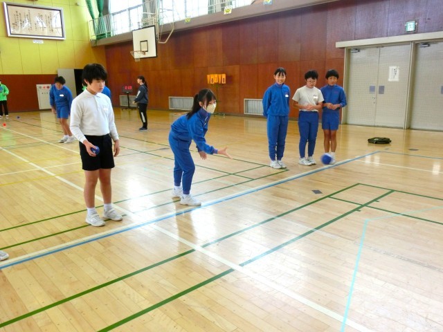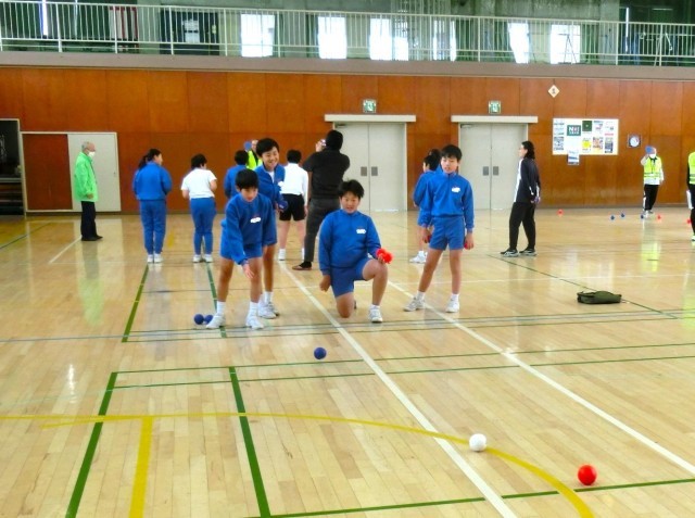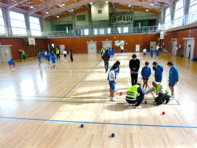 最初に、ボッチャのやり方やルールを説明してくださいました。その後、4つのコートに分かれてゲームをしました。やり方が分かってくると、「どうすれば、近づけることができるか」と自分で考えて投げます。「おしい!」「すごい!」等、一喜一憂しながらもみんな笑顔です。
