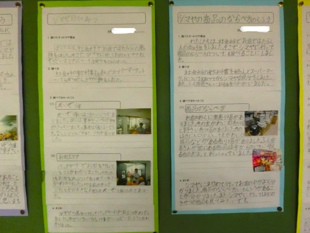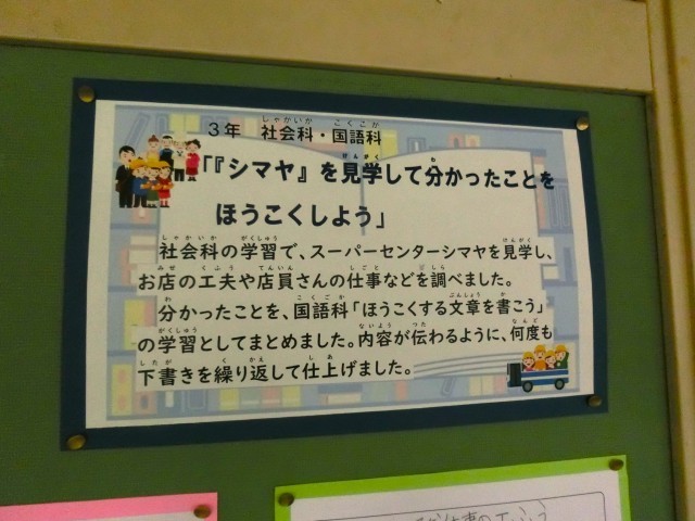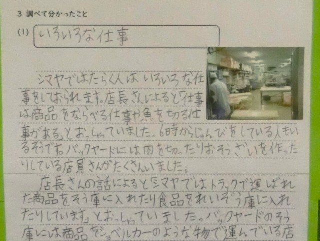 3年生は、社会科で見学したスーパーセンターのまとめを書きました。これは、「店ではたらく人の工夫を知る」という社会科の学習と、「報告するを書く」という国語科の学習を合わせた学習です。