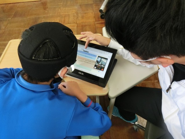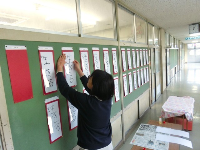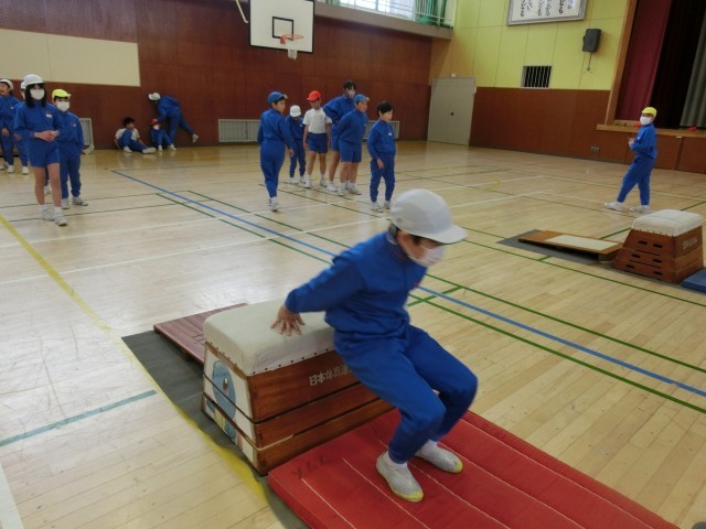 4年生は、体育科で跳び箱運動で、閉脚跳びに挑戦していました。自分ができそうな場を選び、跳び方に慣れようとしています。6年生では、校内でのオンラインで授業を行っていました。先生や友達の話、そして、作成している画面を見ながら学んでいました。2年生の廊下には、書き初めの作品が掲示されています。どれも力強く書かれていました。