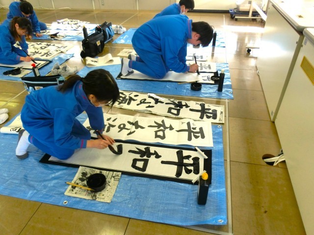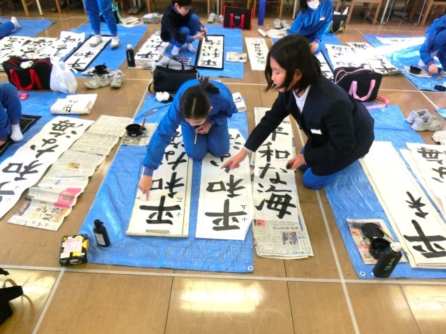 5年生の書き初めの課題は、「平和の海」です。はらいや止めが上手で、勢いのある字です。「よしやるぞ!」と気合を入れて書き始める子供や、「どっちがいいかあ?」と友達に相談している子供等、楽しんでいる姿が多く見られました。