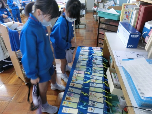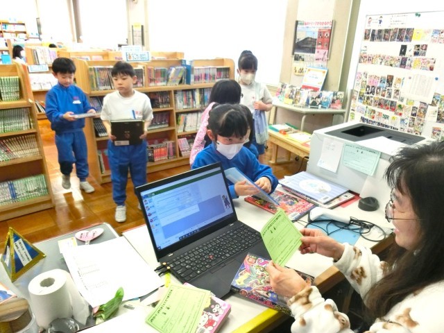 1年生が、図書室で本を借りていました。自分で見つけることができない場合、カードに本の名前を書いて司書の先生に渡すと、探してもらえるそうです。