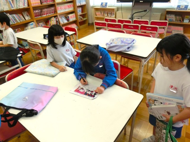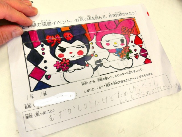 また、今はイベントが行われていて、本を借りるとキャラクターの紙が渡されます。それをカードに貼り、全部貼り終わると、特典がもらえるそうです。