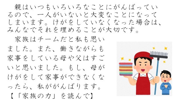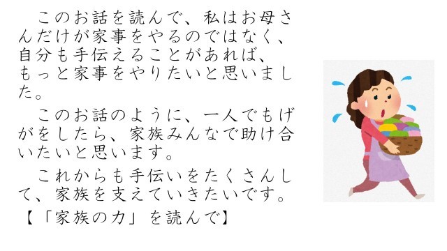 6年生では、その際にいただいた資料をつかった授業を行いました。最初に、改めて「人権とは何か」を確認した後、資料を読み、意見交換をしました。そして、最後に学んだことを感想としてまとめました。まずは、最も身近な家族のことを考えてみたようです。