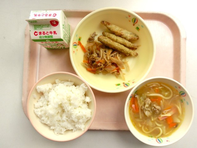 今日の給食は、「長崎県の献立」です。メニューは、ごはん、牛乳、長崎てんぷら(ワカサギのフリッター)、浦上そぼろ(きんぴら)、ちゃんぽん麵です。