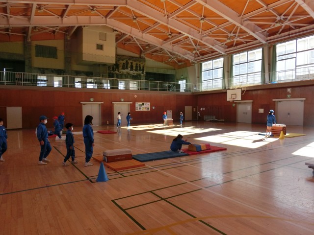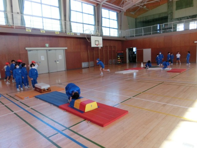 3年生は、マット・跳び箱運動のまとめをしました。これまで練習してきた前転、台上前転、開脚跳びを生かす運動です。