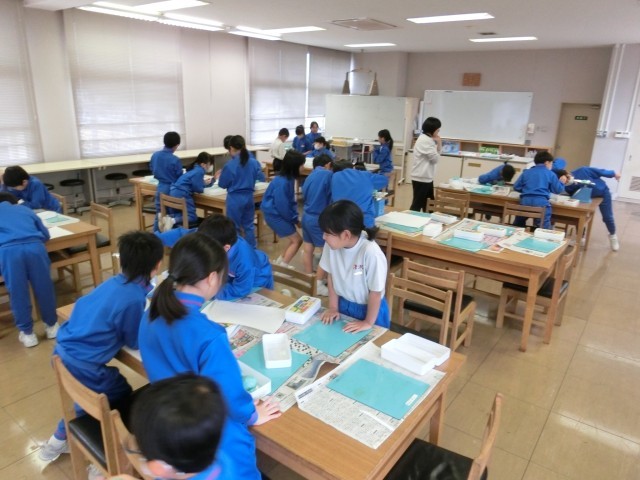 廊下に秤が並べられていました。その秤を使って粘土の重さを測るそうで、一人一人が、ちょうど350gになるように粘土のかたまりを作るのだそうです。「えっ、一回でできた」とびっくりしている子供もいました。