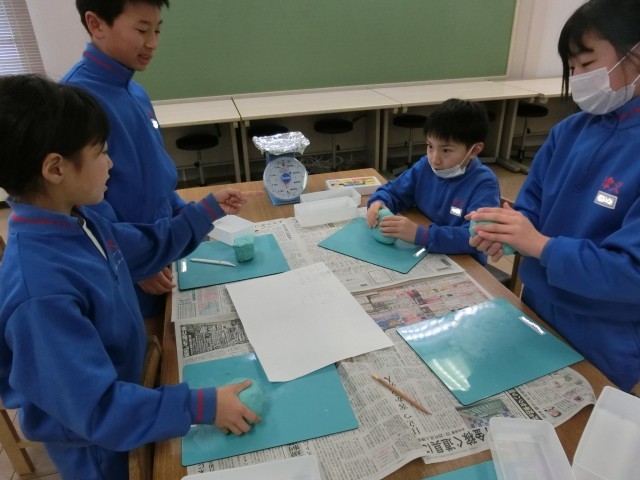 この後、いろいろな形にして重さを測り、物の重さと形の関係を考えていきます。