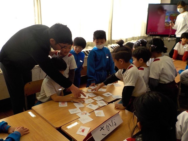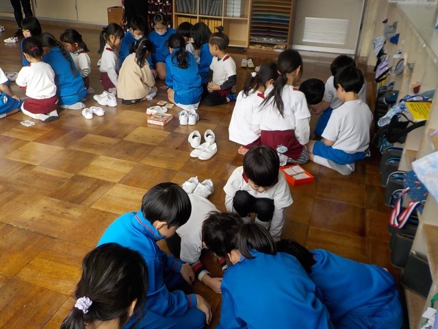 最初の体験は、朝の会です。担任の先生に名前を呼ばれると、少しはずかしそうでしたが、元気に挨拶をしてくれました。次は、1年生と一緒に「いぬぼうかるた」をしました。上手に札を取っている子供もいます。その後は、お店屋さんごっごをしました。1年生がお店屋さんで、園と保育所の子供たちは、お客さんになり、買い物を楽しんでいました。