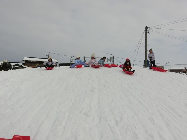 1年生は、築山でソリ遊びです。「いくよーっ。」と滑り出します。そして、「こんなにところまで来たよ。」と長く滑ることができたことにとても満足していました。3年生は、色団対抗で、雪を高く積み上げる競争をしました。一人で雪だるまを作り、それをみんなで積み上げていきます。