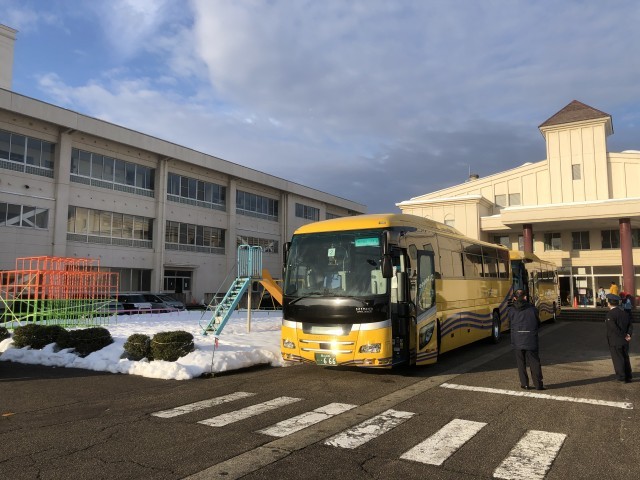 今日はスキー教室です。天候に恵まれました。まもなく出発です。
