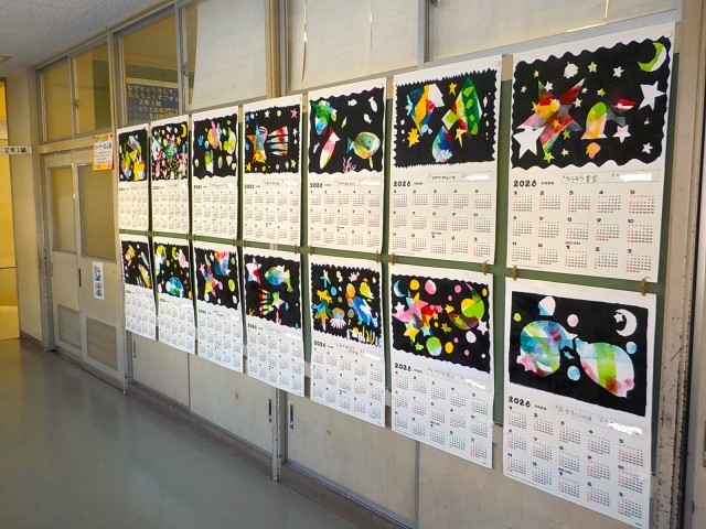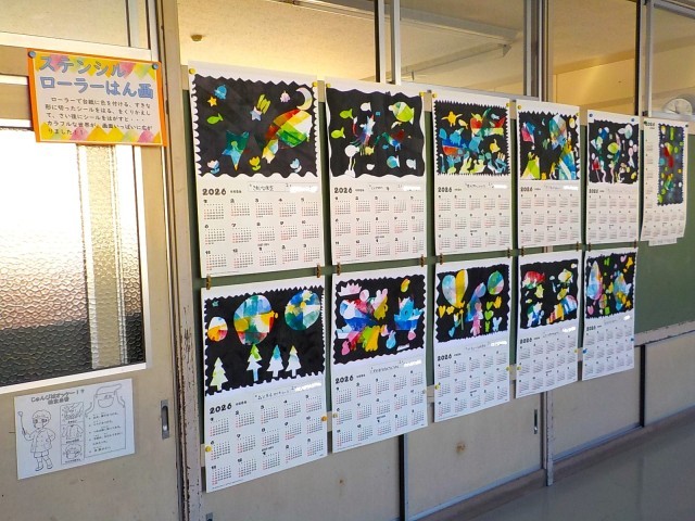 2年生の版画「ステンシル ローラーはんが」が廊下に掲示されています。