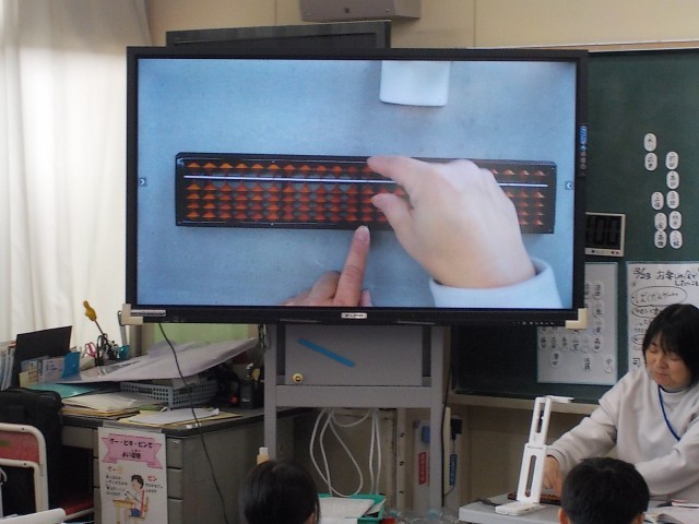 先生が、実物投影機を使って、珠の操作を仕方を説明します。子供たちは、それを見て、真剣に指で珠を上下に動かし、数を入れたり払ったりしていました。