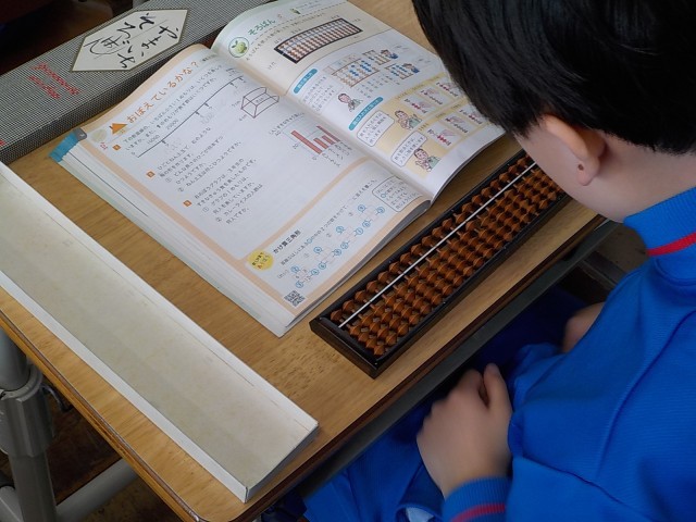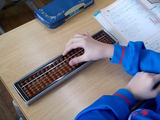 3年生は、算数科の学習で、そろばんに取り組んでいました。初めてさわる子供も多いのではないかと思います。