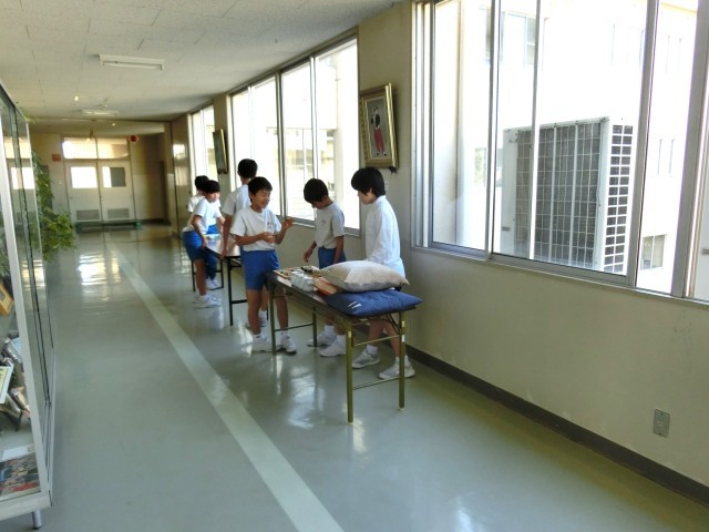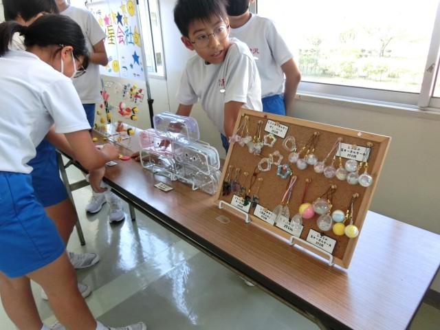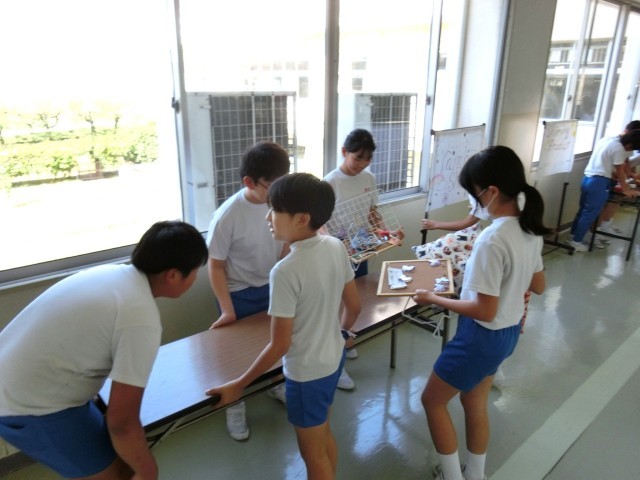 6年生は、学習発表会終了後に行うキッズショップの準備をしていました。今年は、職員室前にお店を並べます。長机1台に商品を配置していました。「楽しみ」「売れるか心配」「気分は最高」等、一人一人の思いは異なりますが、みんな笑顔でした。