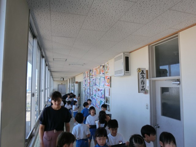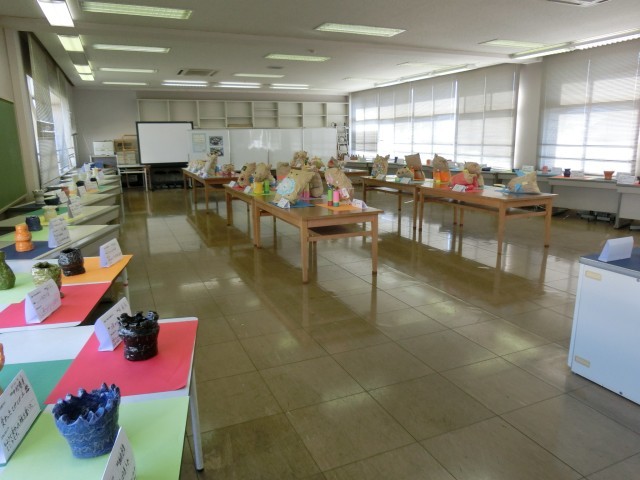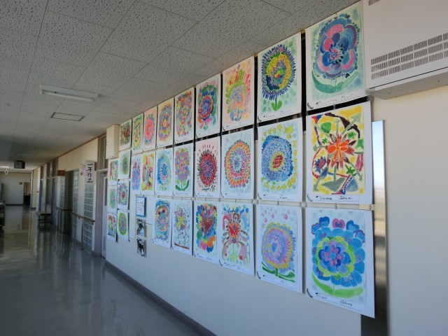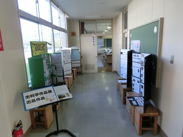 各学年の作品が廊下や特別教室に展示されています。1、3、5年生は平面作品、2、4、6年生は立体作品です。また、夏休みの科学作品も飾られています。