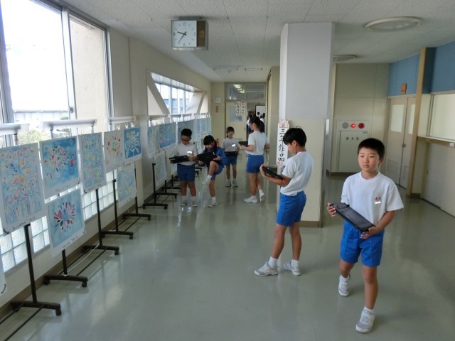 17日の午前中、学年ごとに、作品鑑賞をしました。お気に入りの作品をタブレット端末で撮影し、作品のよさや感じたこと等を、学年に応じたまとめ方をするようです。ゆったりした中なので、子供たちはとても楽しそうでした。