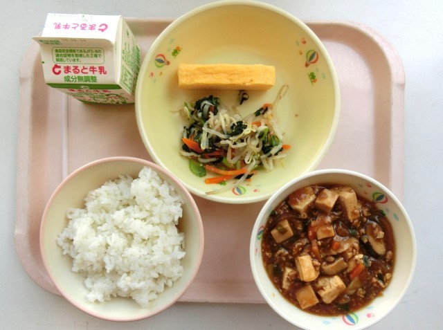 17日の給食は、メルヘン献立で、ハト麦入りごはん、牛乳、卵焼き、はりはりあ、にら入りマーボ豆腐でした。