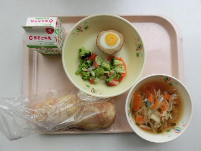 今日の給食は、あげパン、牛乳、スコッチエッグ、ブロッコリーサラダ、にら入りワンタンスープです。