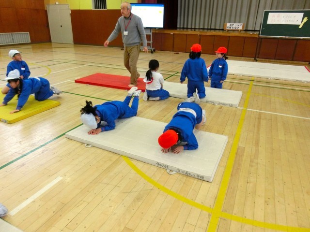 準備体操をした後、まず、後方へ転んだ時のための受け身を練習しました。次に、前方に転んだ時、両手で顔や頭を守る受け身を教えていただきました。