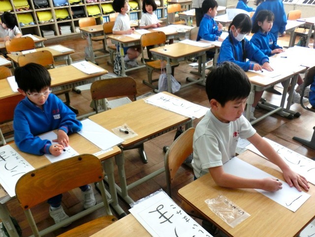 背筋をピンとして、真剣に取り組んでいる姿がとてもよかったです。できあがったら先生に見せ、花丸をもらっている子供もいました。