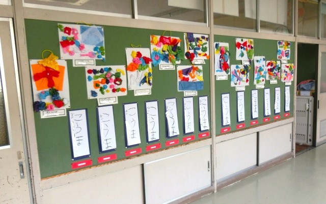 4年生は、体育科で跳び箱運動で、閉脚跳びに挑戦していました。自分ができそうな場を選び、跳び方に慣れようとしています。6年生では、校内でのオンラインで授業を行っていました。先生や友達の話、そして、作成している画面を見ながら学んでいました。2年生の廊下には、書き初めの作品が掲示されています。どれも力強く書かれていました。