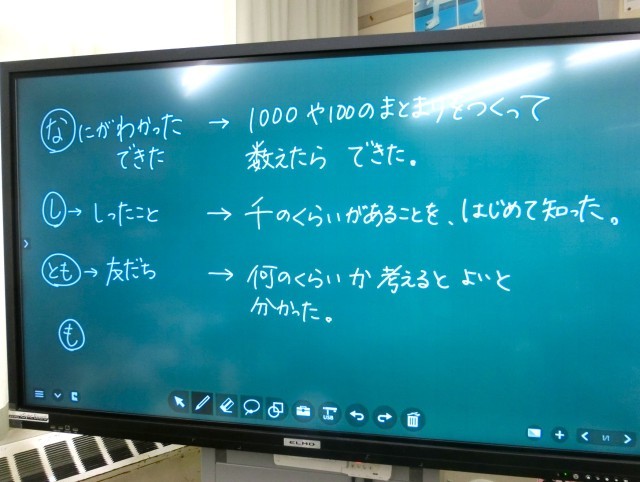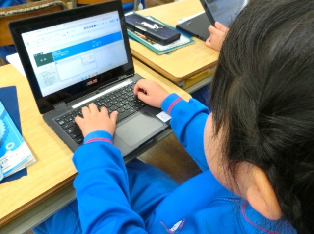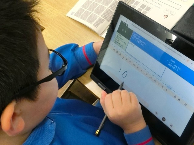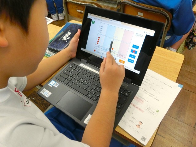 デジタル教科書の図を操作する姿や、考えを共有できるシートに入力する姿が見られました。入力は、ペンでもキーボードでもできます。また、教え合いながら進める場面もありました。子供たちは、「自分のペースでできる」ことに喜びを感じているようでした。そして、課題が終わったら、「わかったこと・できたこと」「初めて知ったこと」「参考にした友だちの考え」等について振り返りをしていました。