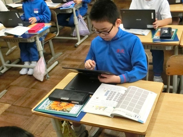 2年生は、算数科「大きな数」で個別学習に挑戦していました。最初に、先生の説明を聞き、やり方を確認します。その後、タブレット端末を使って、一人一人が学習を進めます。