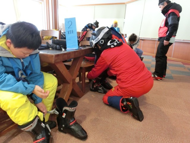 各班ごとに、午前の講習が始まりました。指導の先生の指示に従い、最初は、身なりを整えたりスキー靴を履いたりして準備しました。