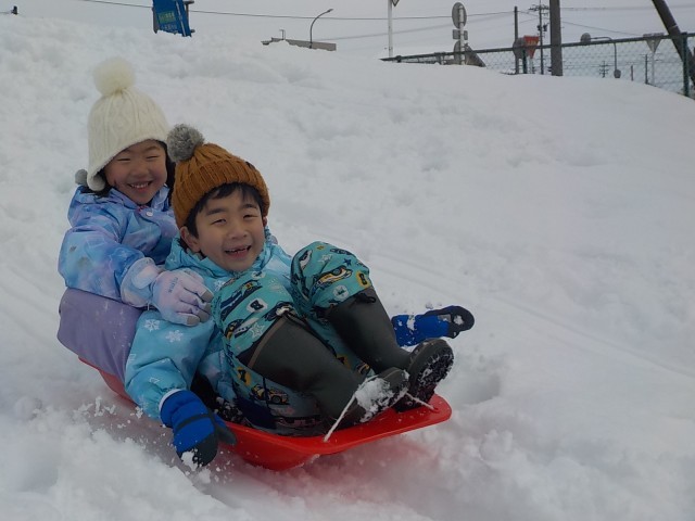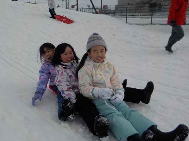 そりを使って築山から滑る子供、雪だるま作りに取り組む子供等、思い思いに活動を楽しみました。