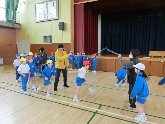 「間をあけずに、全員が跳ぶ」ことに挑戦していました。みんなでリズムをつくり20人ほどが連続して跳んでいてとても驚きました。1年生でも、やり方が分かり、繰り返し、みんなで練習することで、上手にできるようになります。 -