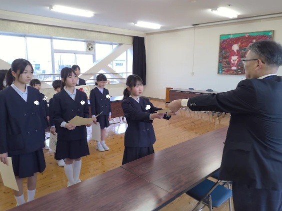 会議室では、県の書初大会や、標語・新聞等の作品で優秀な成績を収めた子供たちに賞状や盾を授与しました。この様子を、給食の時間に各教室で視聴しました。また、予行が終わったあと、市教育委員会の精励表彰を行いました。6年間欠席がなかった子供に賞状が渡されました。